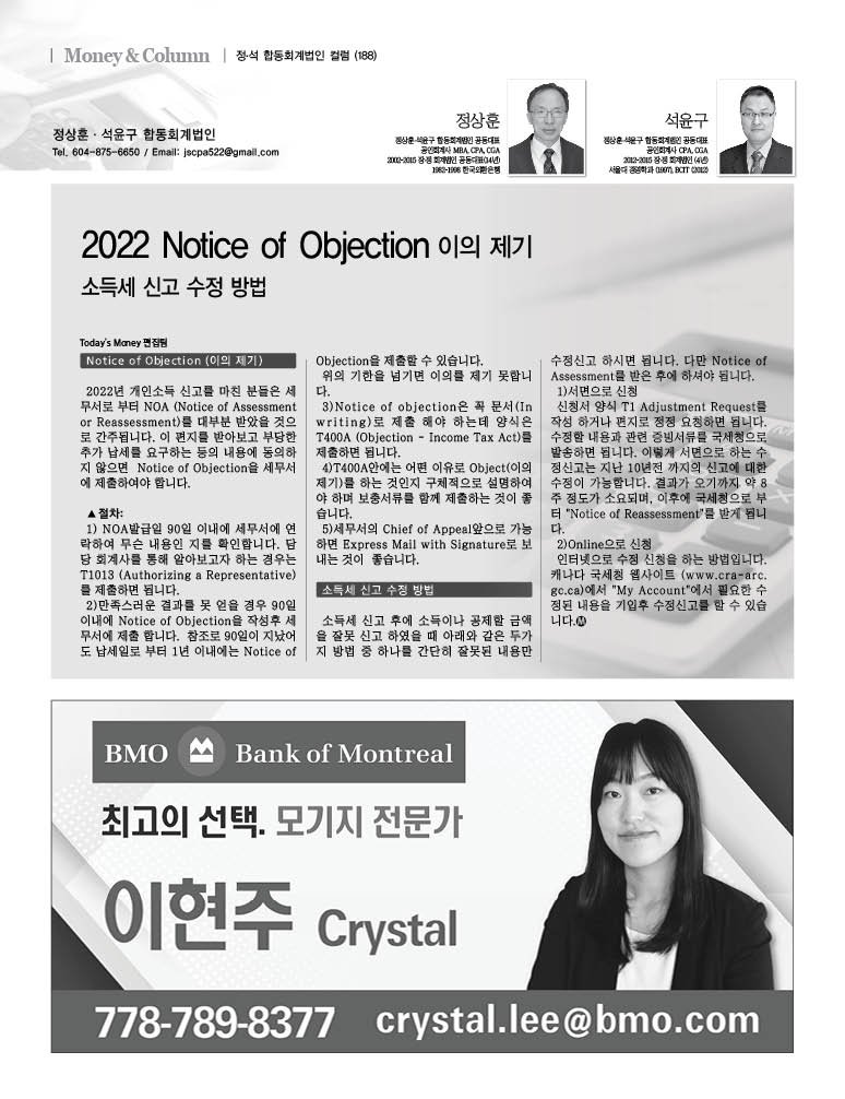 2022년 개인소득 신고를 마친 분들은 세무서로 부터 NOA (Notice of Assessment or Reassessment)를 대부분 받았을 것으로 간주됩니다. 이 편지를 받아보고 부당한 추가 납세를 요구하는 등의 내용에 동의하지 않으면 Notice of Objection을 세무서에 제출하여야 합니다.