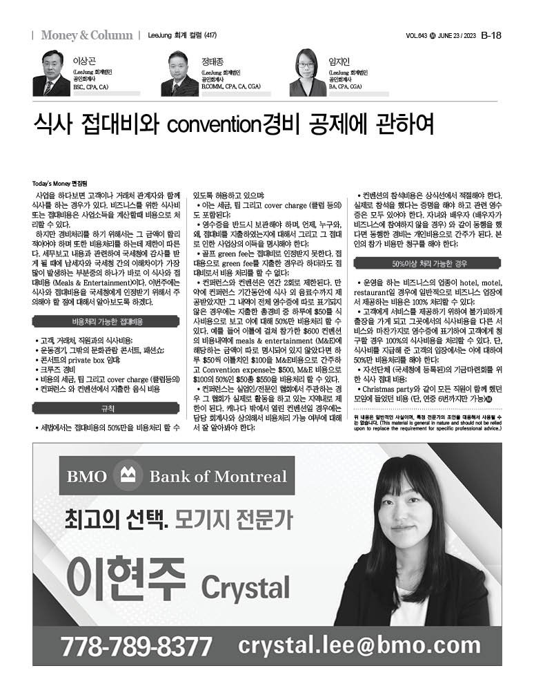 • 컨퍼런스는 실업인/전문인 협회에서 주관하는 경우 그 협회가 실제로 활동을 하고 있는 지역내로 제한이 된다. 캐나다 밖에서 열린 컨벤션일 경우에는 담당 회계사와 상의해서 비용처리 가능 여부에 대해서 잘 알아봐야 한다;