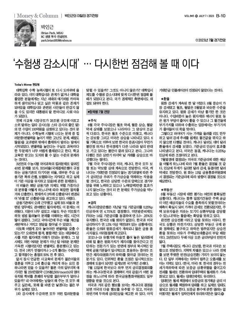 7월 각국 주식시장은 미국, 캐나다, 한국 모두 보합 또는 약보합 상태 계속으로 전망한다. 미국, 캐나다는 기대만큼 진정되지 않는 경기과열에 따른 추가 금리인상 우려가 주가상승을 억제하는 작용을 할 것이고, 한국은 상당한 수준의 압력으로 경기부양을 위해 노력하고 있으나 노력(압력)만큼 효과가 나지 않는다는 것이 더 큰 문제로 주가상승을 억누르고 있는 상황이다.