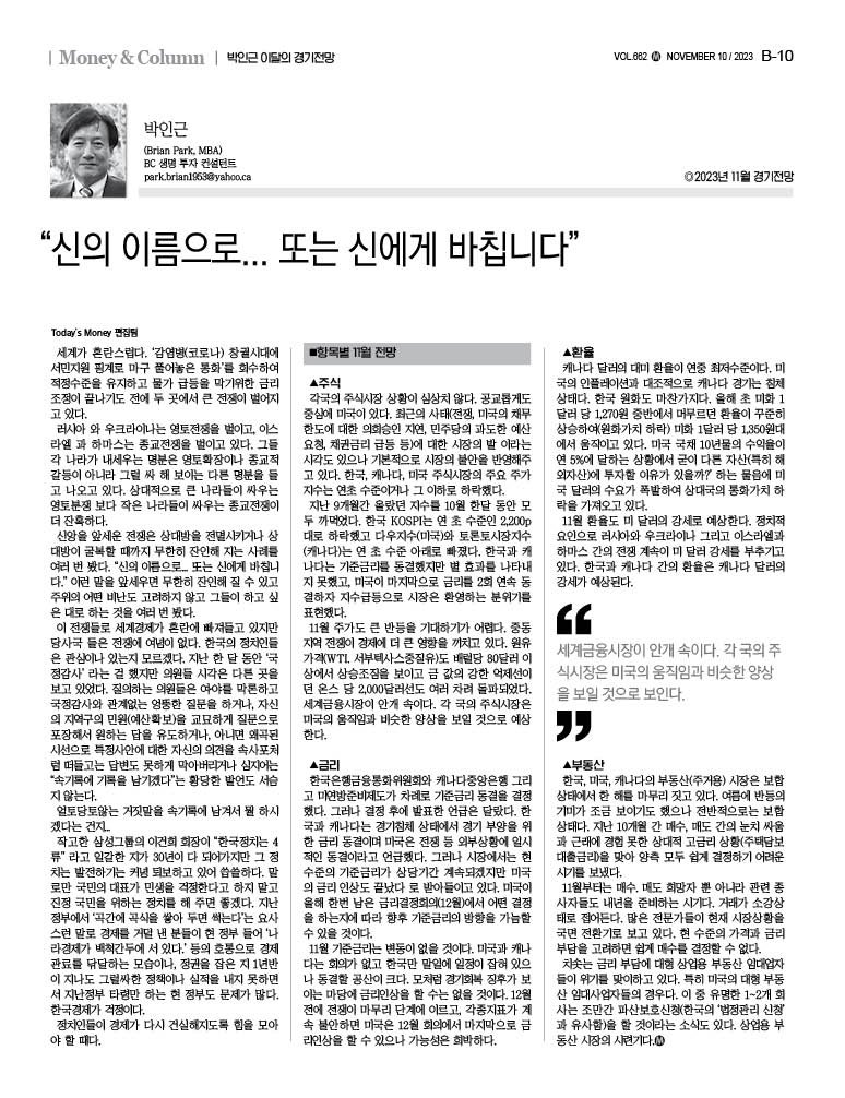 11월 환율도 미 달러의 강세로 예상한다. 정치적 요인으로 러시아와 우크라이나 그리고 이스라엘과 하마스 간의 전쟁 계속이 미 달러 강세를 부추기고 있다. 한국과 캐나다 간의 환율은 캐나다 달러의 강세가 예상된다.