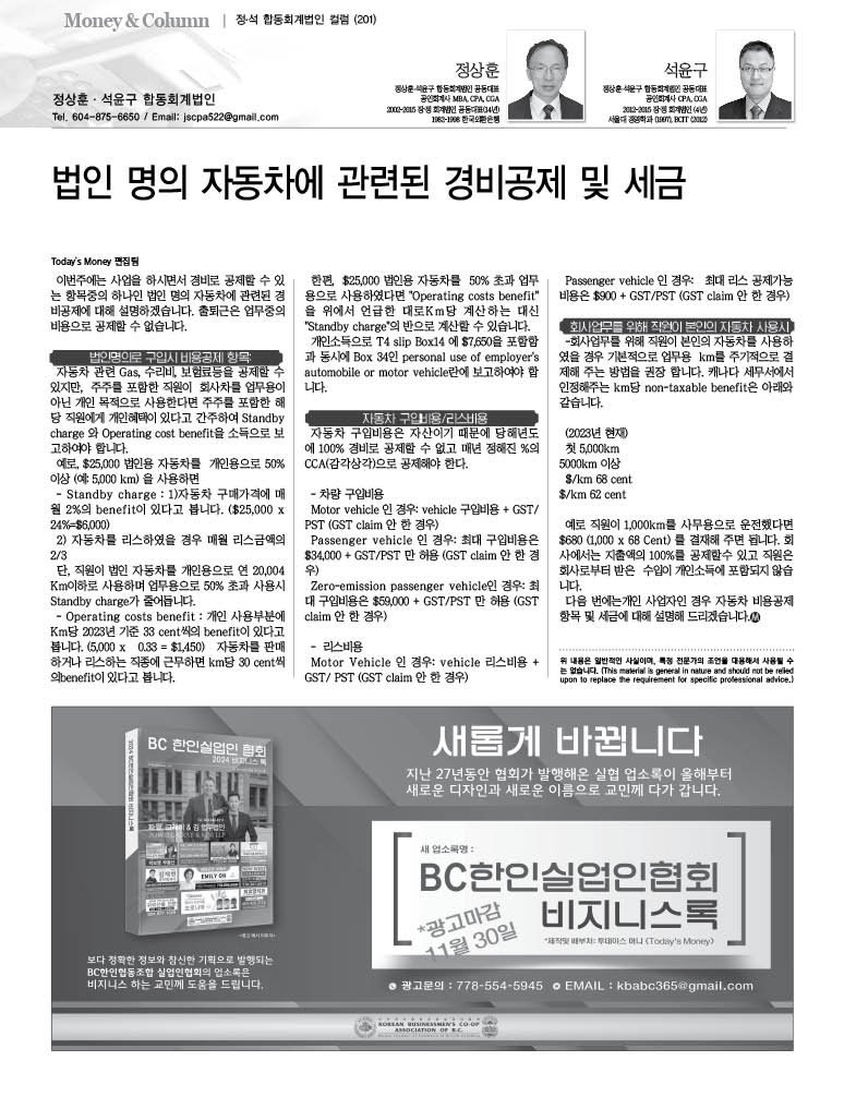자동차 관련 Gas, 수리비, 보험료등을 공제할 수 있지만, 주주를 포함한 직원이 회사차를 업무용이 아닌 개인 목적으로 사용한다면 주주를 포함한 해당 직원에게 개인혜택이 있다고 간주하여 Standby charge 와 Operating cost benefit을 소득으로 보고하여야 합니다.