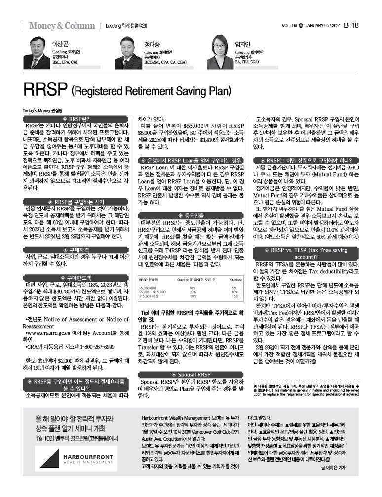 RRSP와 TFSA는 정부에서 제공하고 있는 가장 좋은 절세 프로그램이라고 할 수 있다. 2월 29일이 되기 전에 전문가와 상의를 통해 본인에게 가장 적합한 절세계획을 세워서 불필요한 세금을 줄여보는 것이 어떨까?