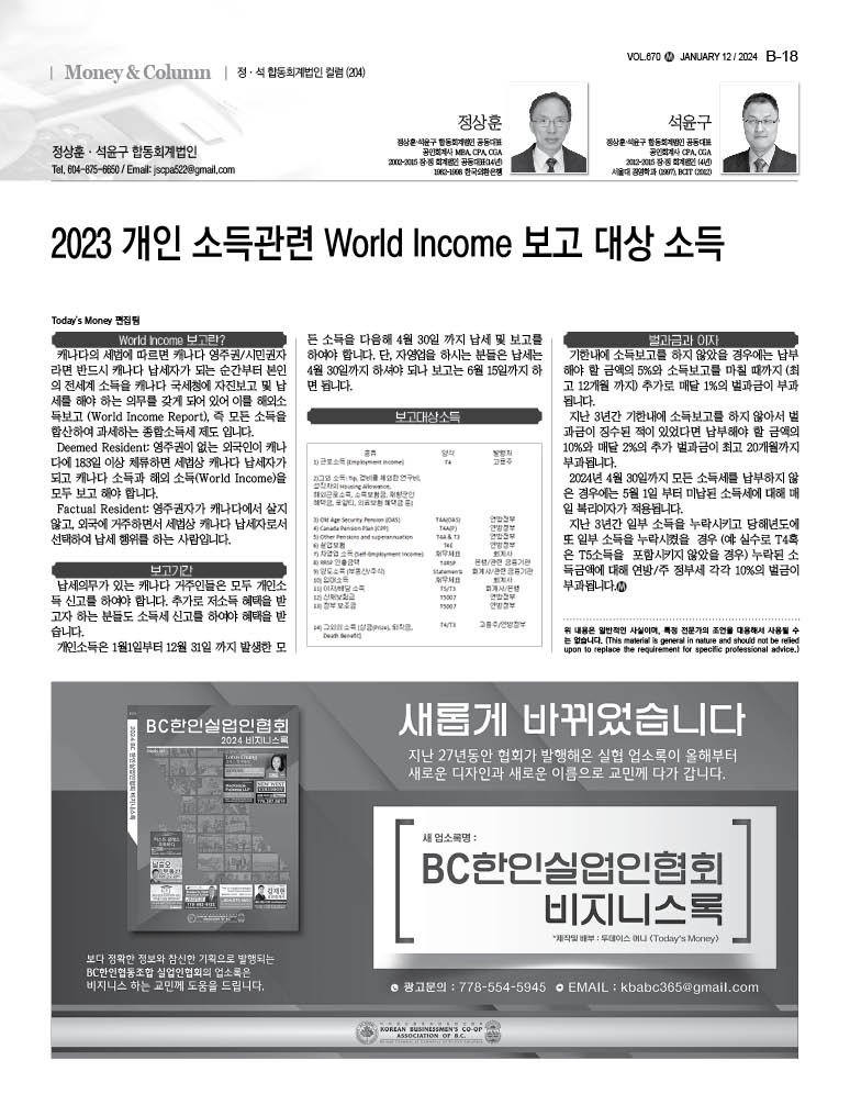 캐나다의 세법에 따르면 캐나다 영주권/시민권자라면 반드시 캐나다 납세자가 되는 순간부터 본인의 전세계 소득을 캐나다 국세청에 자진보고 및 납세를 해야 하는 의무를 갖게 되어 있어 이를 해외소득보고 (World Income Report), 즉 모든 소득을 합산하여 과세하는 종합소득세 제도 입니다.