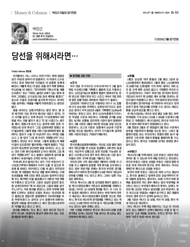 미국 대표 주가지수인 다우DOW지수가 2월 들어 연일 사상최고치를 기록했고 월말에 조금 주춤하고 있다. AI(인공지능)의 활황에 힘입어 ‘엔비디아’등 관련 반도체 기업이 먼저 치고 나갔고 이어서 기업 전반에 걸친 호황기대로 대부분의 기업주가가 올랐다. ‘금리인하 기대무산’으로 주춤하던 지수가 AI 호황에 다시 상승세로 바뀌었다. 토론토지수TSX도 동반상승 중이나 아직 2022년 4월초 기록했던 22,085p에 미치지는 못하고 있다. 한국 KOSPI(종합주가지수)만 작년말 수준과 비슷하다. 국회의원 선거를 40일 정도 남겨둔 상황을 감안하면 시장이 많이 침체되어 있다. 3월 시장은 2월과 비슷한 양상을 보일 것으로 전망하나, 코스피 시장은 보합에서 상승에 가깝게 움직일 것으로 예상한다. 선거가 다가올수록 공약에 대한 시장의 반응도 기대되기 때문이다.