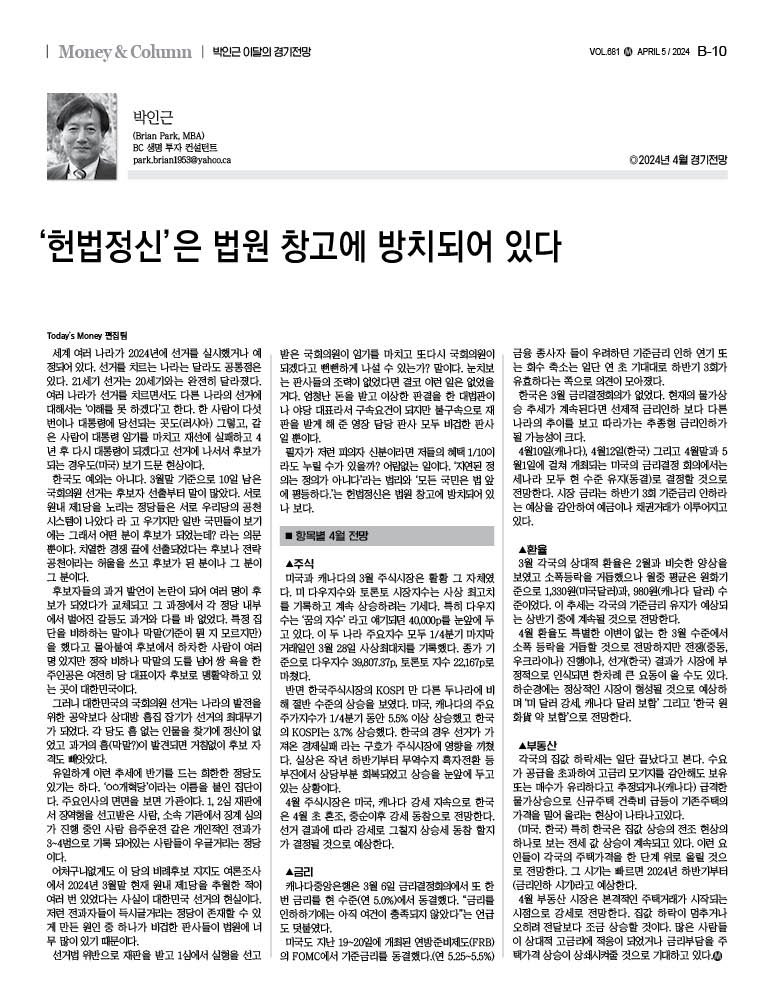 4월 환율도 특별한 이변이 없는 한 3월 수준에서 소폭 등락을 거듭할 것으로 전망하지만 전쟁(중동, 우크라이나) 진행이나, 선거(한국) 결과가 시장에 부정적으로 인식되면 한차례 큰 요동이 올 수도 있다. 하순경에는 정상적인 시장이 형성될 것으로 예상하며 ‘미 달러 강세, 캐나다 달러 보합 그리고 ‘한국 원화貨 약 보합으로 전망한다.