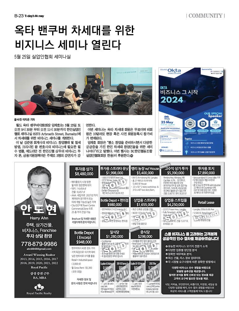월드 옥타 밴쿠버지회(회장 임채호)는 5월 25일 토 오전 9시 30분 부터 오전 11시 30분까지 한인실업인협회 세미나실 (6373 Arbroath Street, Burnaby)에서 차세대를 위한 비지니스 세미나를 개최한다.
