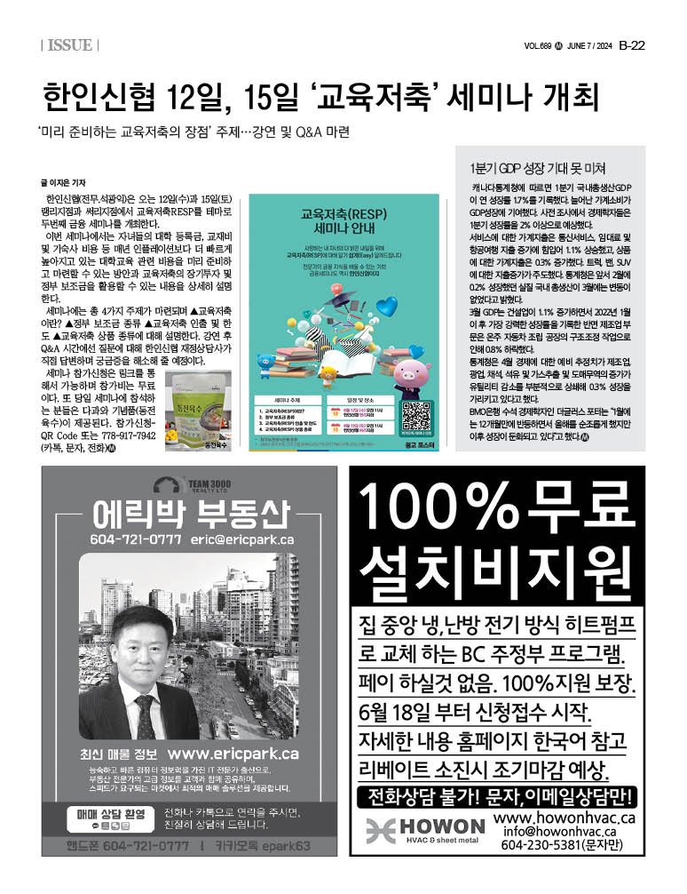 한인신협(전무.석광익)은 오는 12일(수)과 15일(토) 랭리지점과 써리지점에서 교육저축RESP를 테마로 두번째 금융 세미나를 개최한다.