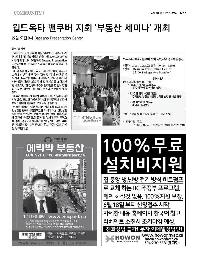 월드옥타 밴쿠버지회(회장 임채호)는 부동산 관련 세미나 및 네트위킹의 장을 7월 27일(토) 오전 9시부터 오후 12시 30분까지 Bassano Presentation Center(2100 Springer Avenue, Burnaby)에서 진행한다.
