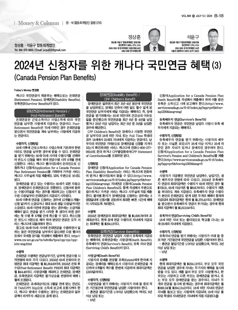 CPP Children’s Benefit은 장애자나 사망한 국민연금 납부자의 18세 미만 자녀, 또는 Full Time 학생의 경우 18세에서 25세의 자녀에게 지급하는 연금이다. 납부자의 국민연금 기여분으로 장애연금을 신청할 자격이 되는지 확인하려면 서비스 캐나다에 전화 (1-800-277-9914)로 문의 하거나 CPP불입명세서 (CPP Statement of Contributions)를 조회하면 된다.