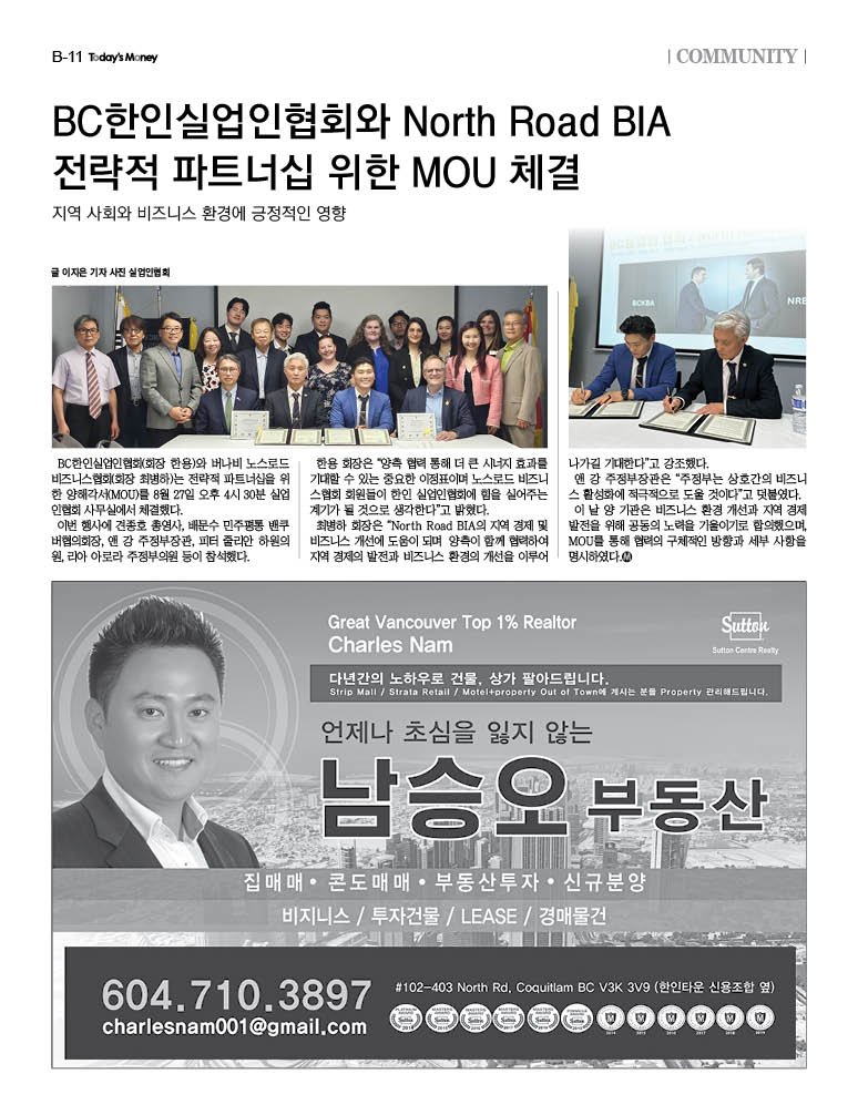 BC한인실업인협회(회장 한용)와 버나비 노스로드 비즈니스협회(회장 최병하)는 전략적 파트너십을 위한 양해각서(MOU)를 8월 27일 오후 4시 30분 실업인협회 사무실에서 체결했다. 이번 행사에 견종호 총영사, 배문수 민주평통 밴쿠버협의회장, 앤 강 주정부장관, 피터 줄리안 하원의원, 리아 아로라 주정부의원 등이 참석했다. 한용 회장은 “양측 협력 통해 더 큰 시너지 효과를 기대할 수 있는 중요한 이정표이며 노스로드 비즈니스협회 회원들이 한인 실업인협회에 힘을 실어주는 계기가 될 것으로 생각한다”고 밝혔다. 최병하 회장은 ” North Road BIA의 지역 경제 및 비즈니스 개선에 도움이 되며 양측이 함께 협력하여 지역 경제의 발전과 비즈니스 환경의 개선을 이루어 나가길 기대한다”고 강조했다.