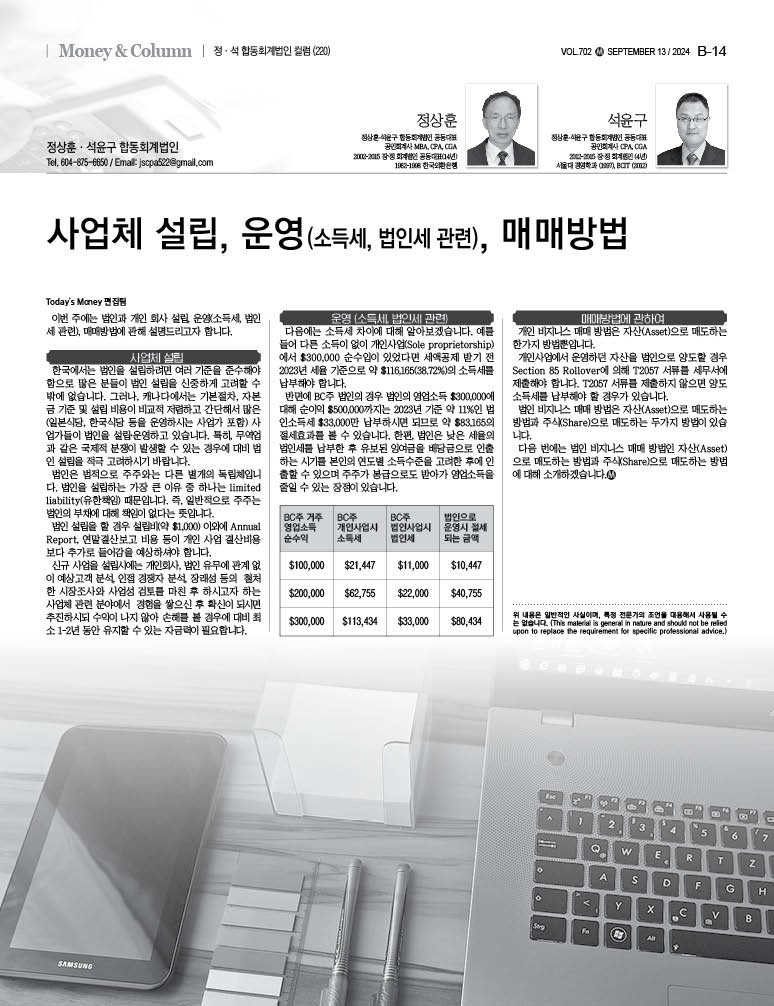 반면에 BC주 법인의 경우 법인의 영업소득 $300,000에 대해 순이익 $500,000까지는 2023년 기준 약 11%인 법인소득세 $33,000만 납부하시면 되므로 약 $83,165의 절세효과를 볼 수 있습니다. 한편, 법인은 낮은 세율의 법인세를 납부한 후 유보된 잉여금을 배당금으로 인출하는 시기를 본인의 연도별 소득수준을 고려한 후에 인출할 수 있으며 주주가 봉급으로도 받아가 영업소득을 줄일 수 있는 장점이 있습니다.
