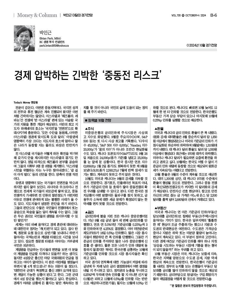 10월 환율은 9월의 수준이 계속될 것으로 예상한다. 대미 1,300원 상단, 대 캐나다 975원 수준에서 환율이 형성될 것으로 전망한다. 그러나 중동 전쟁이 확산되면(전쟁규모가 커지면) 미 달러화의 강세가 예상된다. 안전자산 선호 현상이다. 참고로 안전자산의 1위로 꼽는 금 가격은 어느새 온스 당 2,500달러를 훌쩍 넘어 2,680달러 선에서 거래되고 있다.