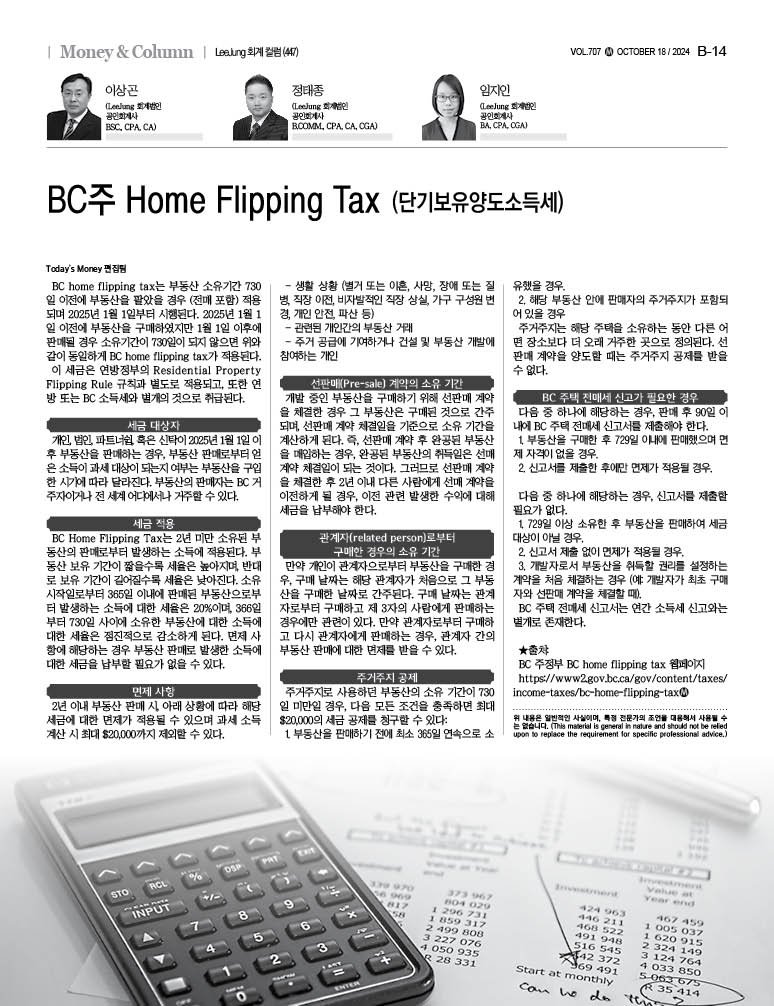 BC home flipping tax는 부동산 소유기간 730일 이전에 부동산을 팔았을 경우 (전매 포함) 적용되며 2025년 1월 1일부터 시행된다. 2025년 1월 1일 이전에 부동산을 구매하였지만 1월 1일 이후에 판매될 경우 소유기간이 730일이 되지 않으면 위와 같이 동일하게 BC home flipping tax가 적용된다.