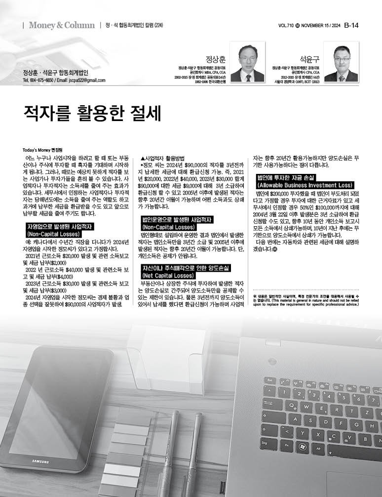 *정모 씨는 2024년 $90,000의 적자를 3년전까지 납세한 세금에 대해 환급신청 가능. 즉, 2021년 $20,000, 2022년 $40,000, 2023년 $30,000 합계 $90,000에 대한 세금 $9,000에 대해 3년 소급하여 환급신청 할 수 있고 2005년 이후에 발생된 적자는 향후 20년간 이월이 가능하며 어떤 소득과도 상쇄가 가능합니다.