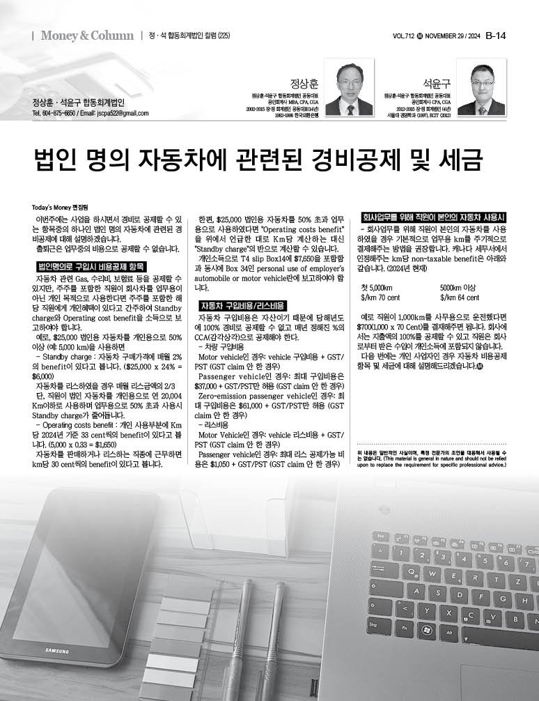 자동차 관련 Gas, 수리비, 보험료 등을 공제할 수 있지만, 주주를 포함한 직원이 회사차를 업무용이 아닌 개인 목적으로 사용한다면 주주를 포함한 해당 직원에게 개인혜택이 있다고 간주하여 Standby charge와 Operating cost benefit을 소득으로 보고하여야 합니다.