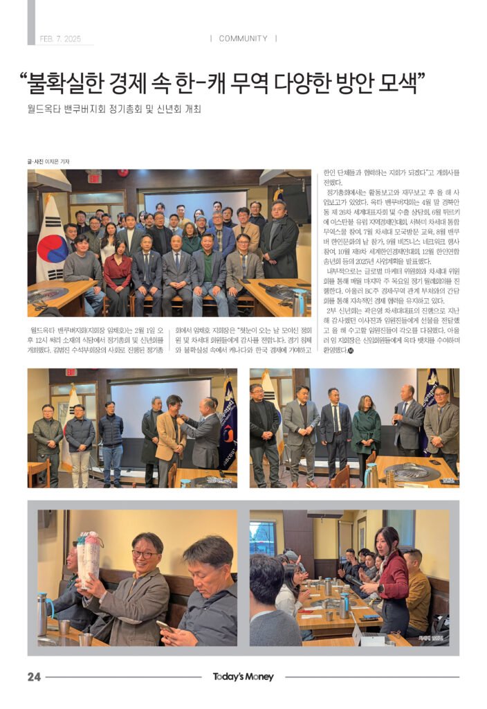 월드옥타 밴쿠버지회(지회장 임채호)는 2월 1일 오후 12시 써리 소재의 식당에서 정기총회 및 신년회를 개최했다. 김범진 수석부회장의 사회로 진행된 정기총회에서 임채호 지회장은 “첫눈이 오는 날 모이신 정회원 및 차세대 회원들에게 감사를 전합니다. 경기 침체와 불확실성 속에서 캐나다와 한국 경제에 기여하고 한인 단체들과 협력하는 지회가 되겠다”고 개회사를 전했다.
