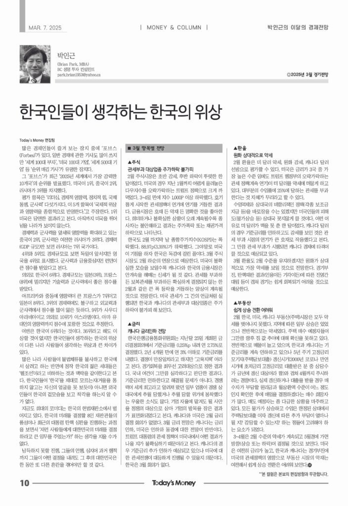 3~4월은 2월 수준의 약세가 계속되고 5월경에 가면 방향(상승 또는 하락)이 결정될 것으로 보인다. 미국은 여전히 금리가 높고, 한국과 캐나다는 경기부진에 미국의 관세정책의 영향으로 부동산 시장의 악재는 여전해서 쉽게 상승 전환은 어려워 보인다.