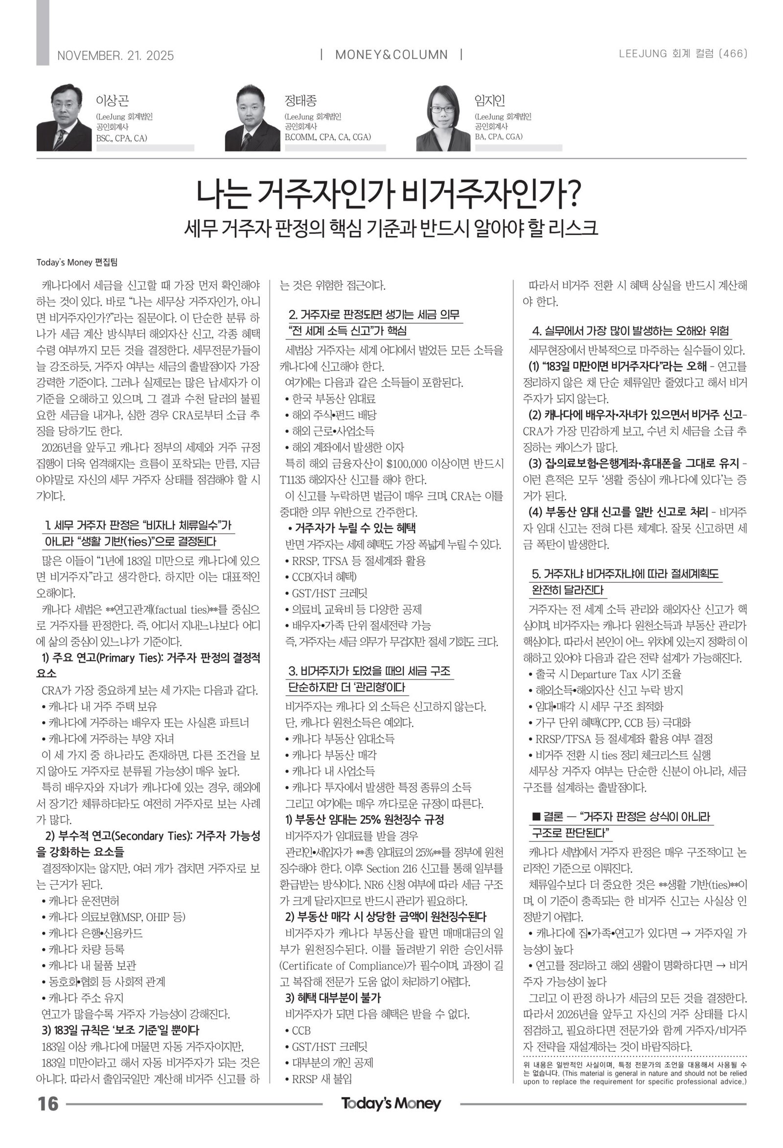 2026년을 앞두고 캐나다 정부의 세제와 거주 규정 집행이 더욱 엄격해지는 흐름이 포착되는 만큼, 지금이야말로 자신의 세무 거주자 상태를 점검해야 할 시기이다.