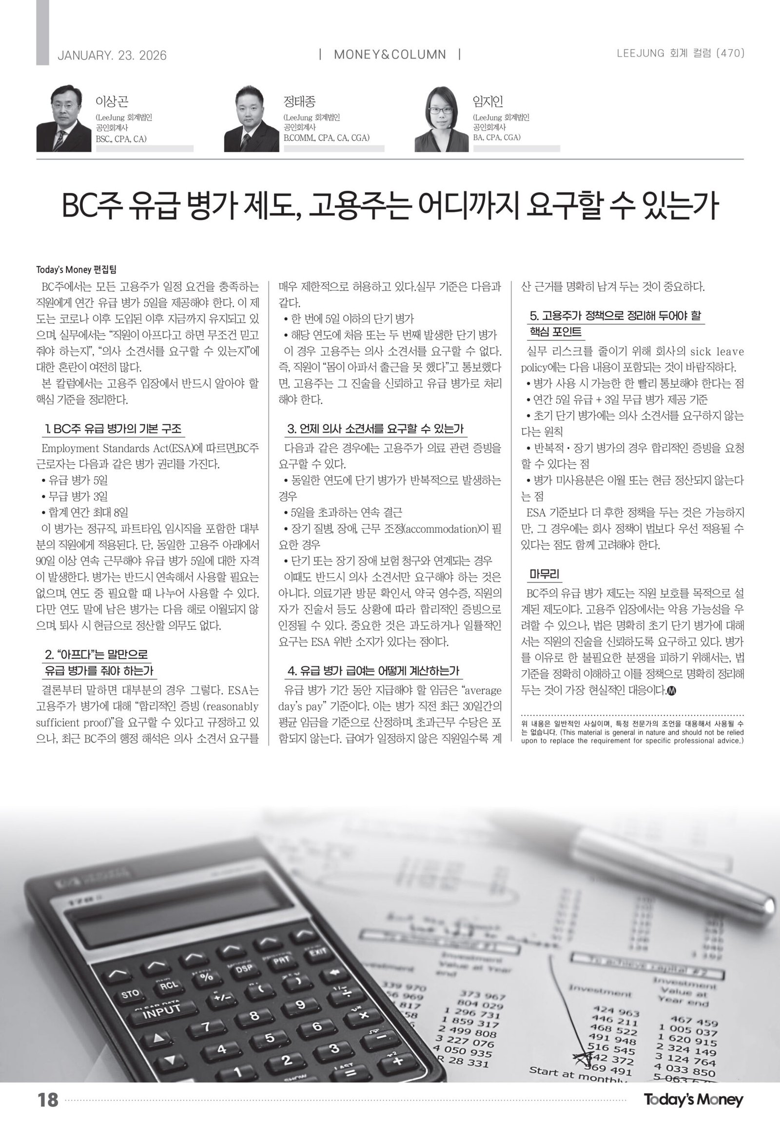 BC주에서는 모든 고용주가 일정 요건을 충족하는 직원에게 연간 유급 병가 5일을 제공해야 한다. 이 제도는 코로나 이후 도입된 이후 지금까지 유지되고 있으며, 실무에서는 “직원이 아프다고 하면 무조건 믿고 줘야 하는지”, “의사 소견서를 요구할 수 있는지”에 대한 혼란이 여전히 많다. 본 칼럼에서는 고용주 입장에서 반드시 알아야 할 핵심 기준을 정리한다.
