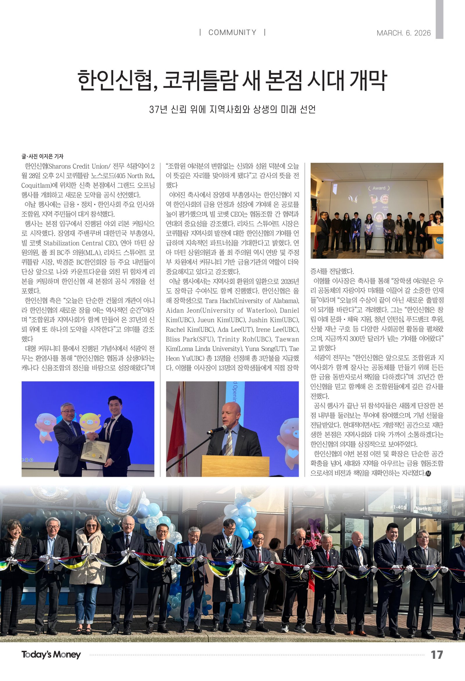 한인신협(Sharons Credit Union/ 전무 석광익)이 2월 28일 오후 2시 코퀴틀람 노스로드(405 North Rd., Coquitlam)에 위치한 신축 본점에서 그랜드 오프닝 행사를 개최하고 새로운 도약을 공식 선언했다.