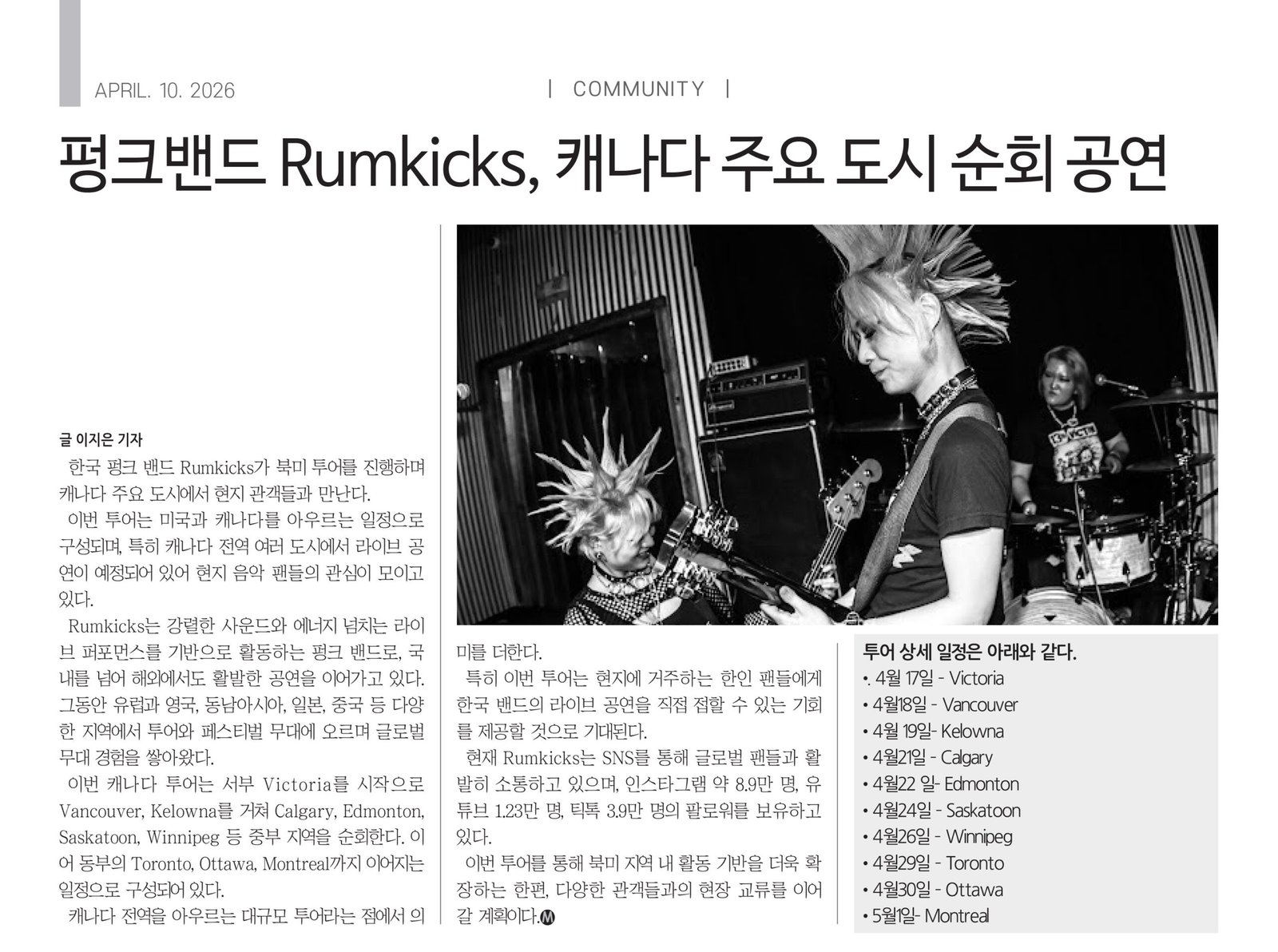 한국 펑크 밴드 Rumkicks가 북미 투어를 진행하며 캐나다 주요 도시에서 현지 관객들과 만난다.