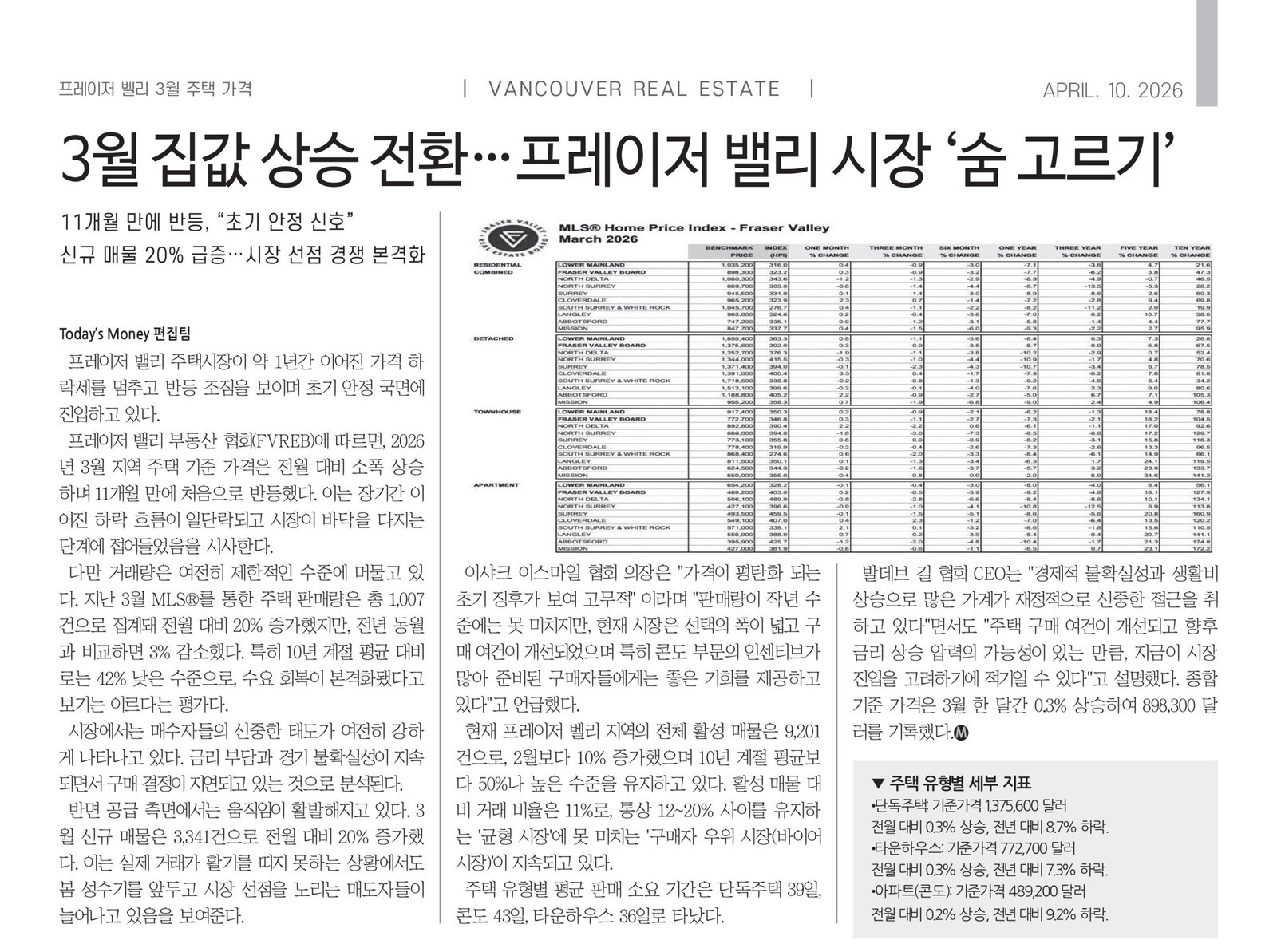 프레이저 밸리 부동산 협회(FVREB)에 따르면, 2026년 3월 지역 주택 기준 가격은 전월 대비 소폭 상승하며 11개월 만에 처음으로 반등했다. 이는 장기간 이어진 하락 흐름이 일단락되고 시장이 바닥을 다지는 단계에 접어들었음을 시사한다.